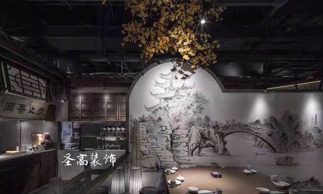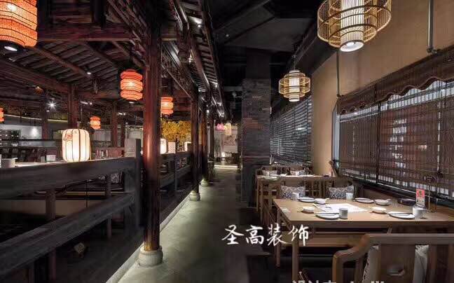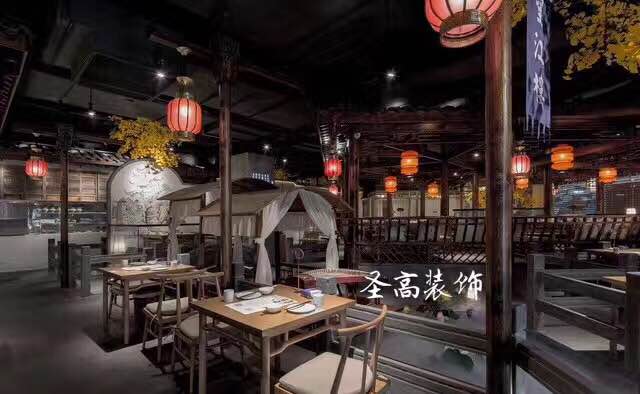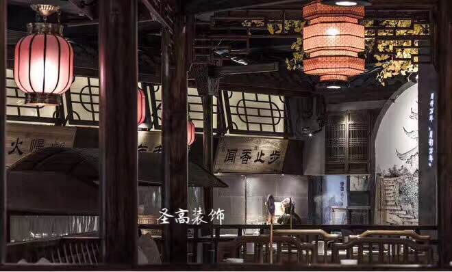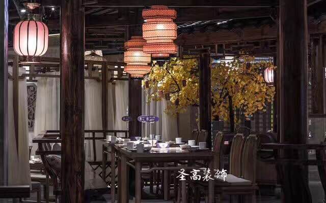 设计师采用古式古香的设计装修风格,小桥、流水、绿植,错落有致,过道之处不时有古亭出现,享受就餐时带来的闲情逸致!