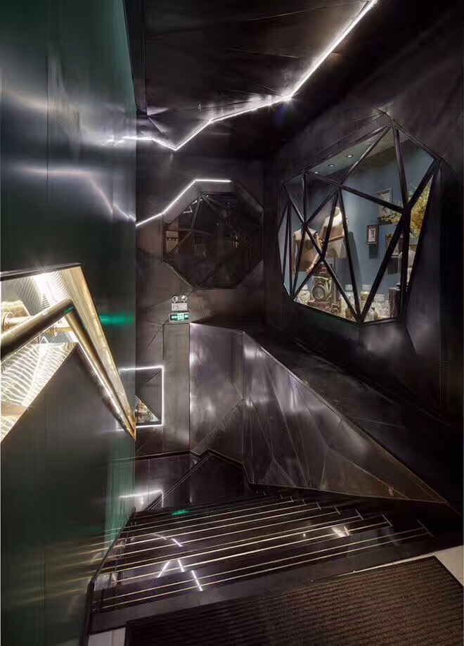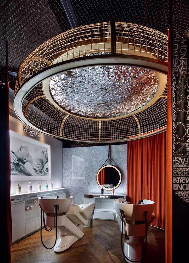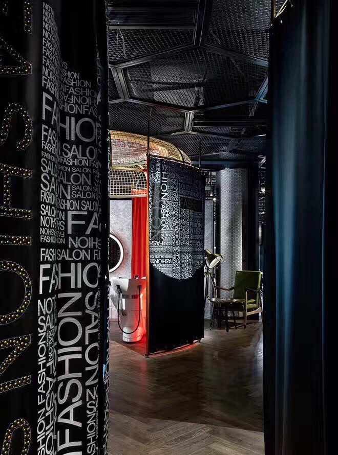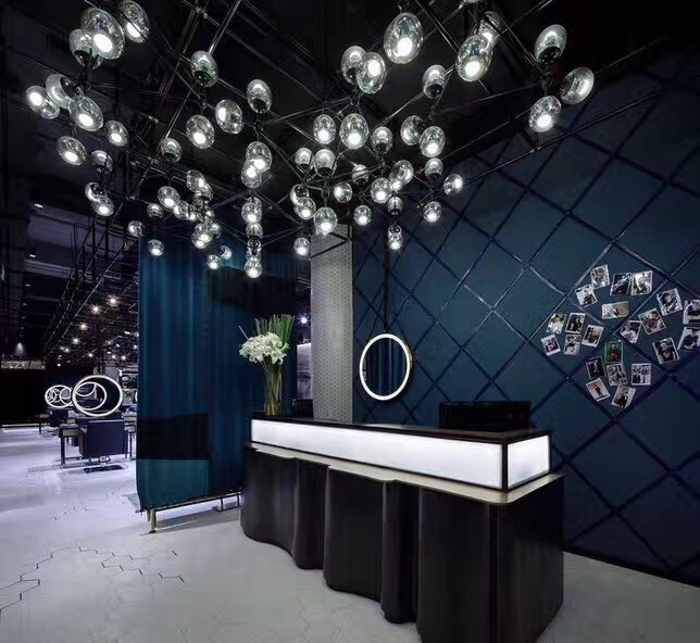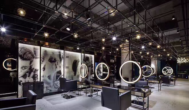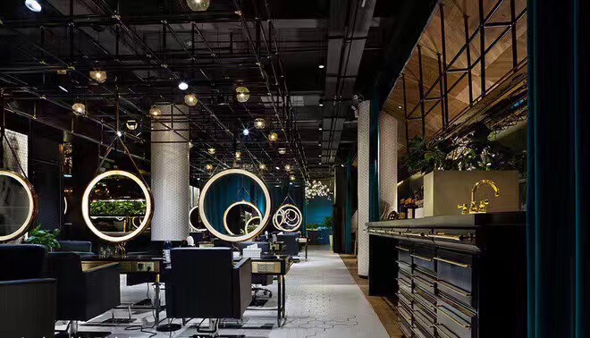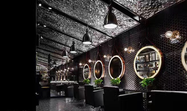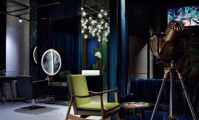 理发店的消费群体大多数为年轻人,他们不喜欢千篇一律的装修,比较个性的装修风格。首艺造型美发店就走个性化路线,为了稍微缓和这种黑色的压抑,理发店的灯光、前台颜色、凳子都采用蓝绿色。黑色和蓝绿的对比冲击搭配形成了理发店装修的时尚个性风格。